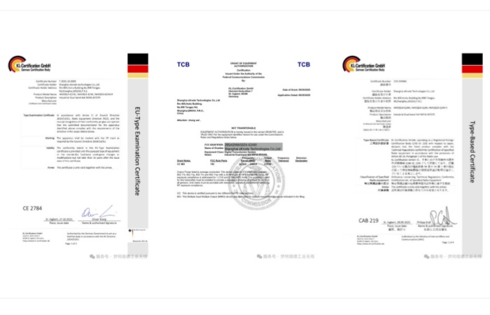 从中国制造,到全球信任-,伊珂络德 IWA5824-624X 系列工业级Wi-Fi 6基站 近日顺利通过 欧盟公告机构(Notified Body)NB2784 的严格检测,正式获得欧盟CE认证。同时,该系列还一举获得美国FCC与日本MIC认证,成为伊珂络德工业无线迈向全球市场的又一重要里程碑。